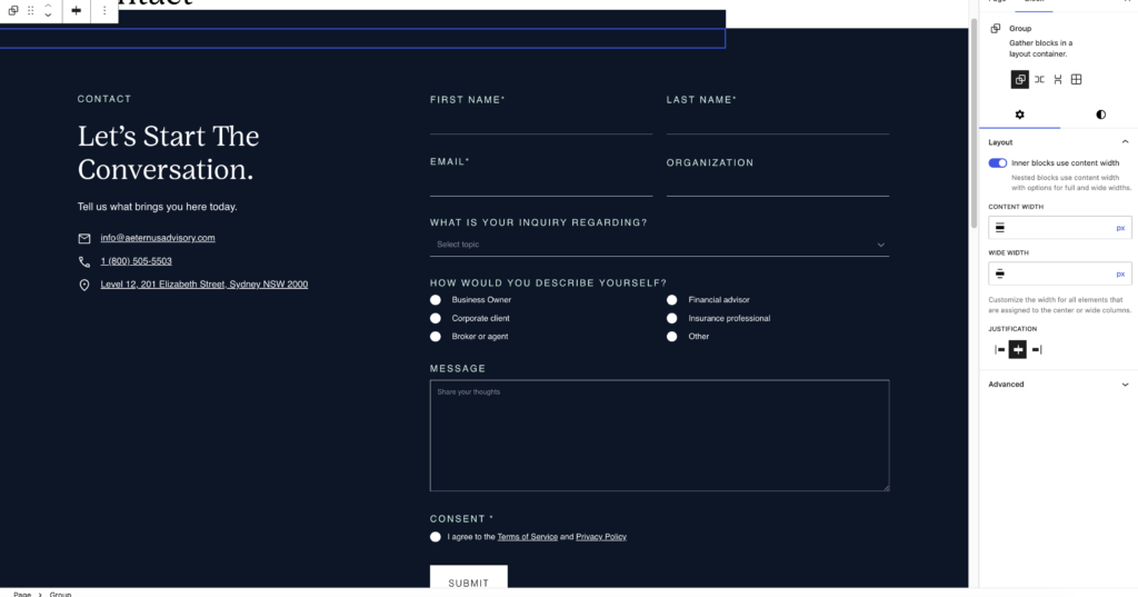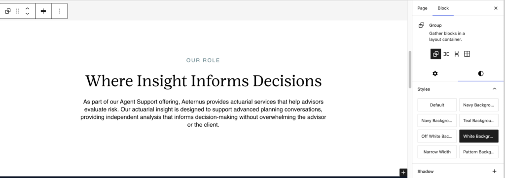 - Narrow: Needs to be nested inside a Default or Coloured Group to be centred on the page with padding. Makes content width narrow; Does NOT centre content or add padding to the top/bottom.
