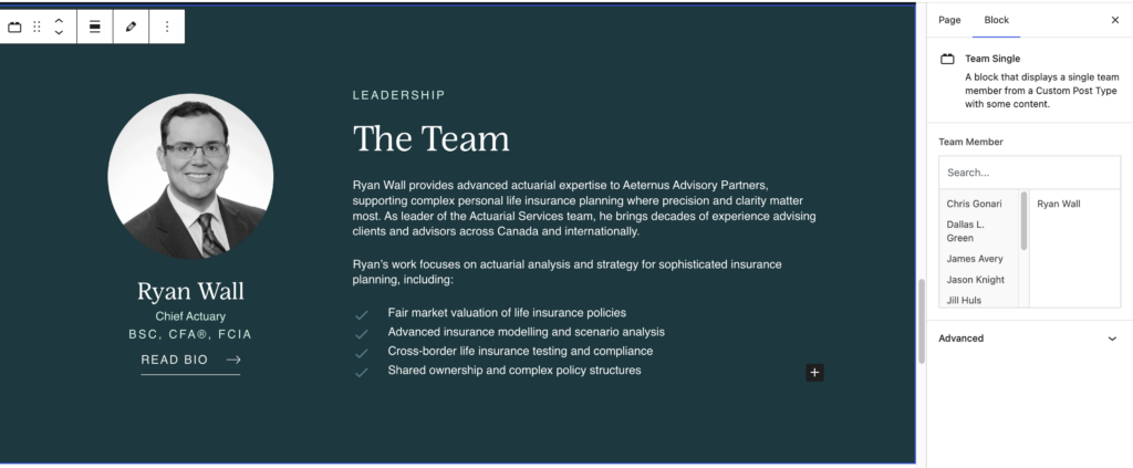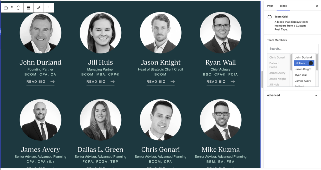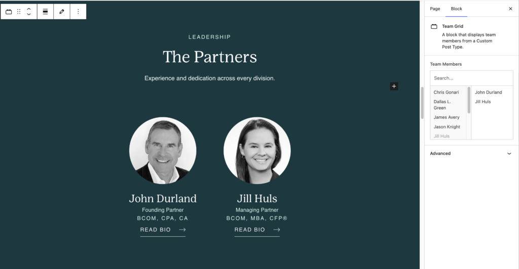 The team member post type are displayed in the Team Single and Team Grid blocks.